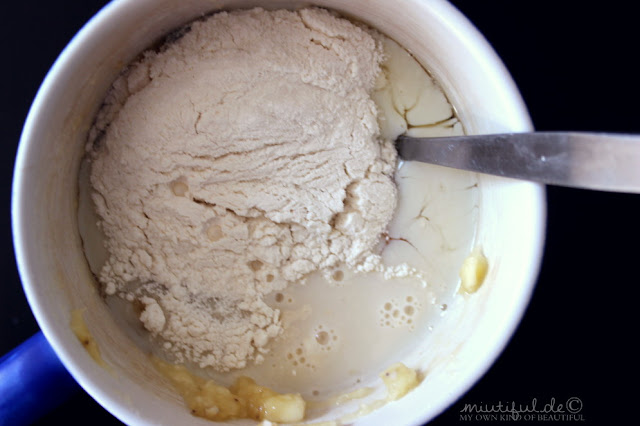 Dann kommen die restlichen drei Zutaten hinzu und werden gut durchmischt. Auf die schnelle kann man den Teig auch ganz einfach mit der Gabel zubereiten – nur darauf achten, dass keine Mehlklumpen entstehen.