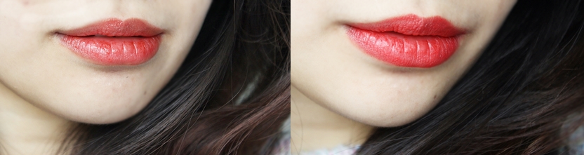 Der Auftrag ist bei beiden Lip Crayons sehr angenehm und durch die Stift-artige Form auch wirklich sehr einfach – besonders die Lippenränder. Aufgrund der Farbintensität und Deckkraft ist 045 Romantic “verzeihender”, während ich mit dem semi-matten 240 Striking oft und schnell über die Ränder zeichne.
