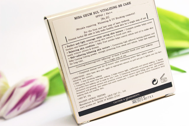 “Strahlende Haut, glatt und eben und dies nur mit einem Item umgesetzt- möglich? Ja! Mit MISA Geum Sul Vitalzing BB Cake erleben Sie Multifunktionalität: Falten-Pflege, Hautaufhellung und Schutz vor UV-Strahlen in Einem! Besonders geeignet für diejenigen, die nach einem Produkt gesucht haben, welches BB Cream und Puder in sich vereint und zudem, zeitgleich eine Anti-Falten-Pflege inklusive wünschen! Der Kuchen, für besonders schöne Momente.